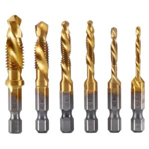 Aquafix タップドリルセット 6本セット 金属製 ドリルタップ 超硬ドリルビット 六角軸 面取りタップ 多機能 穴あけ ねじ切り タップ スパイラル HSS 高速度鋼 M3 M4 M5 M6 M8 M10 鉄工/金工/工業用(チタンゴールド)