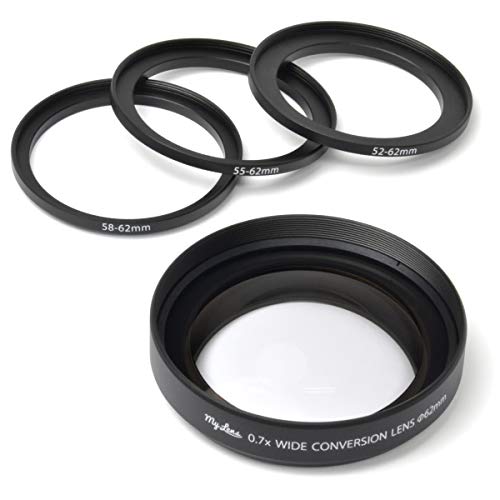 My Lens ビデオカメラ用広角0.7倍薄型ワイドコンバージョンレンズ。レンズ径は52mm、55mm、58mm、62mmに対応し、Full HD VIDEOもサポート。モデルはJTT Online MLE62W07です。