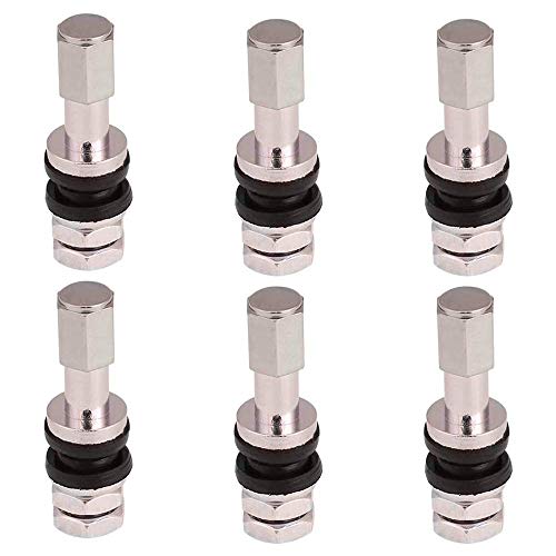 6個セットのホイール用インサイドバルブ。全長45mmの金属製チューブレスバルブで、耐熱コアを使用した直型ストレートデザイン。汎用性が高く、タイヤバルブとして適しています。TR43E規格。