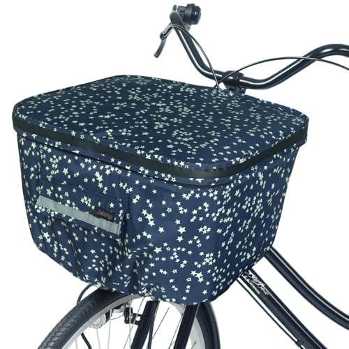 二段式前カゴカバーMY-165は、防水機能付きで、ネイビーにスター柄のデザイン。自転車の荷物をしっかり守り、雨でも安心。取り付け簡単で、スタイリッシュにカスタマイズできます。