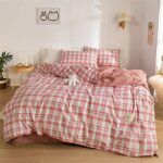 Lifecamoの布団カバー4点セット(シングル)は和風のシンプルデザインで、ピンクのチェック柄プリントが特徴。掛け布団カバー、フラットシーツ、枕カバーが含まれ、肌に優しく、洗えるのでお手入れ簡単です。