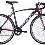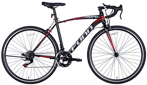 21Technologyの自転車、ロードバイクGT100Sは、マットブラック/レッドのデザインで、700x28cタイヤ、シマノ14段変速ギヤ、ドロップハンドル、補助ブレーキ、前後キャリパーブレーキを搭載しています。