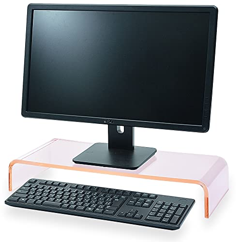 Kuaiモニター台はアクリル製で高さ9cmのLサイズ(クリアオレンジ)。4色・2サイズ展開があり、卓上のパソコン使用やキーボード収納に最適。スタイリッシュで機能的なデザイン。