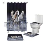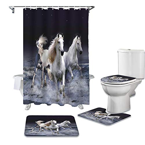LHGBGBLNの4-in-1馬シャワーカーテンセットは、滑り止めカーペットとトイレカバーを含み、防水仕様でバスルームに最適です。おしゃれで実用的なアイテムです。