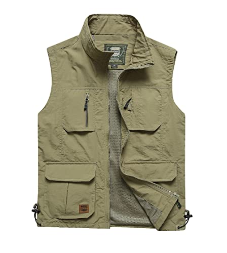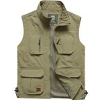 Manatsulifeの多機能メンズアウトドアベスト。軽量でメッシュ素材、夏に最適。カメラマンや釣り用にデザインされ、春秋にも対応。カラーはカーキ、サイズはMです。