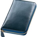 ムラの通帳ケースは、高級ゴートレザー製の本革マルチケース。磁気防止・スキミング防止機能付きで、じゃばらタイプのデザイン。色はネイビーで、スタイリッシュに持ち運べます。