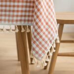 オレンジの正方形テーブルクロス(135*135cm)は、綿麻布製の縞柄デザイン。フリンジエッジで可愛いおしゃれな印象を与え、水洗い可能で耐熱性もあり、食卓を彩るアイテムです。