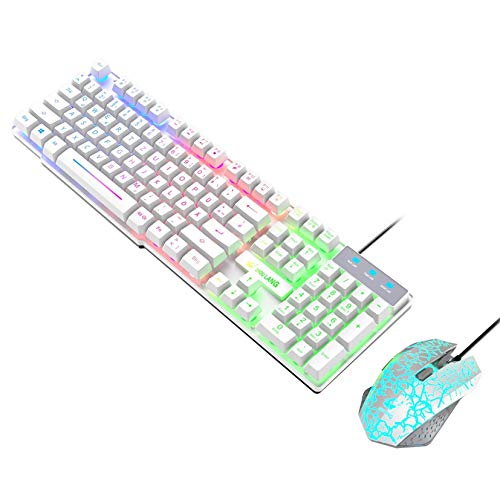 Qingyuguolinのゲーミングキーボードとマウスセット。レインボーLEDバックライト、104キー、USB有線接続。人間工学デザインでゲームやオフィスに最適な多用途モデル(白)。