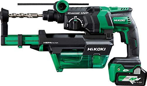 HiKOKIの36V充電式ハンマドリルDH36DPF(2XP)は、最大20mmのコンクリート穴あけ能力を持ち、蓄電池2個、充電器、ケース、集じんシステム付き。