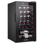 ECLのコンプレッサー式ワインセラーは、24本収納可能な63Lの大型モデル。温度範囲は5℃~18℃で、省エネ設計。三層ガラスとUVカット機能を搭載し、LEDライトも完備。家庭・業務用に最適。
