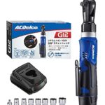 ACDelco G12 10.8V 充電式ラチェットレンチ。3/8″(9.53mm)サイズで最大トルク45ft-lbs(60Nm)。正逆転切替機能、LEDライト内蔵。ソケットと日本語取扱説明書付属。