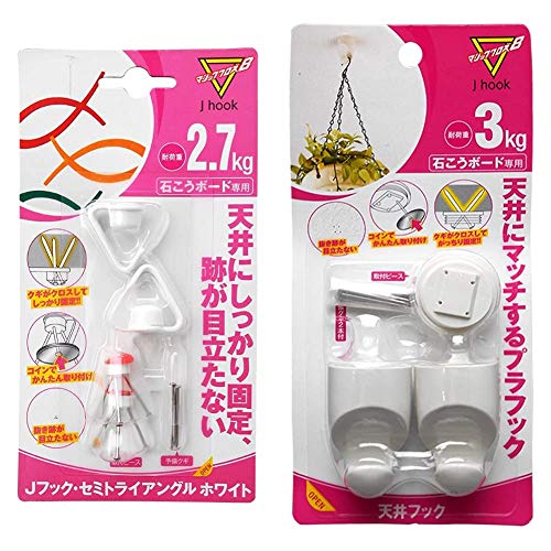 日軽産業 フック マジッククロス8 J hook セミトライアングル ホワイト MJ-020W 奥行1×高さ2×幅1.7cm キャップ2個、取付ピース2個、予備クギ9本 2入 & フック マジッククロス8 J hook 天井フック MC-004W 奥行2.75×高さ4.5×幅2.75cm 取付ピース2コ、クギ10本 2個入【セット買い】 高価買取中