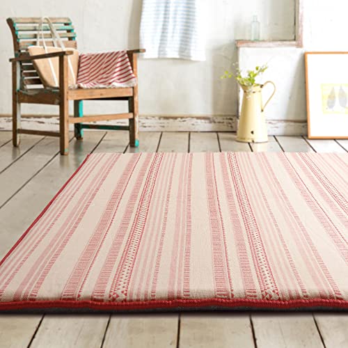 アイリスオーヤマのジャガードラグ185×185cm。全厚約3cmで滑り止め付き、ホットカーペット対応。3畳サイズで、はっ水加工と遮音効果を備えた低ホルムの北欧デザインマット。カラーはレッド。