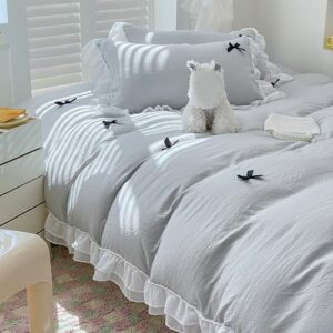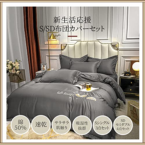 肌に優しい素材のシングル布団カバーセット。洋式・和式兼用で、掛け布団カバー、ボックスシーツ、枕カバーの3点または4点セット。速乾タイプ、防ダニ加工、おしゃれな刺繍グレー。洗い替えにも最適です。
