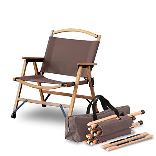 FIELDOOR クラシックチェアは、ダークブラウンの木製フレームとコットンシートを使用したローチェアです。コンパクトに収納でき、耐荷重は100kg。脚キャップ付きで、収納バッグも付属。アウトドアやキャンプに最適です。