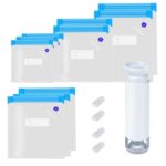 真空パック袋10枚セット、手動ポンプと密封用スライダー4枚付。PA&PE材質で二重チャック構造、鮮度を長持ちさせ、抗菌効果あり。食材や衣類の圧縮にも最適。