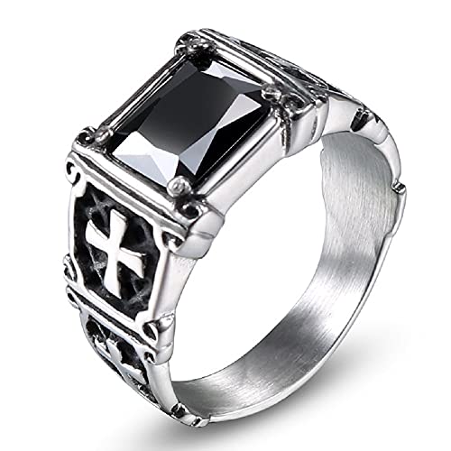 Rockyuのメンズリングは、黒のジルコニアとオニキスを使用した十字架デザイン。厄除けやお守りとしても人気。素材はステンレスで、ファッションアクセサリーとしても洗練された印台スタイル。サイズは20号(指回り62.5mm)。