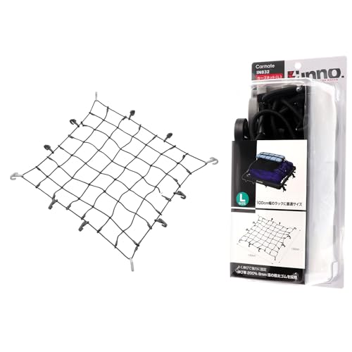 カーメイト(CARMATE)のinno 荷物固定ネットはLサイズ(100×100cm)、8mm径の極太ゴム製。安定した荷物固定を実現し、トランク内のアイテムをしっかりサポートします。