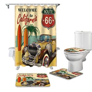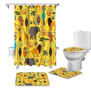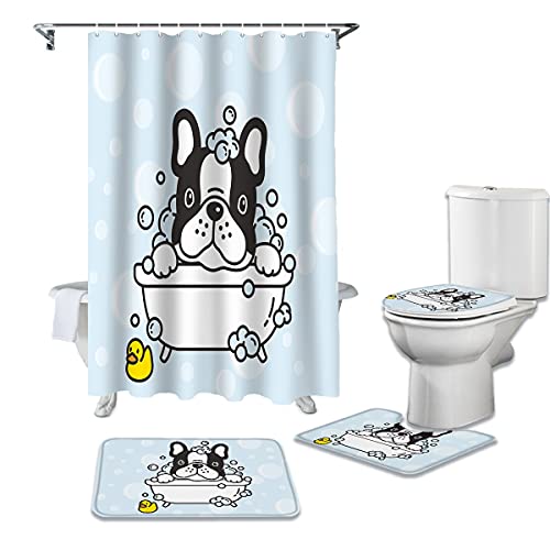 LHGBGBLNの4ピースシャワーカーテンセットは、バスルーム用の防水シャワーカーテン、カーペット、便座クッションが含まれており、可愛いブルドッグデザインが特徴です。