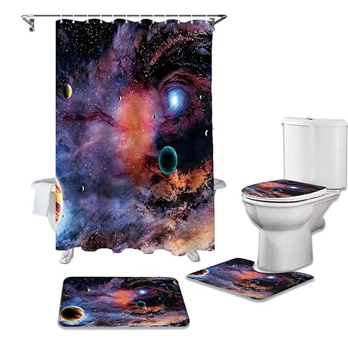 LHGBGBLNの4ピースシャワーカーテンセットは、ユニバースプラネットギャラクシー柄で防水機能があります。バスルームカーペットや便座クッションも含まれ、トータルでおしゃれな空間を演出します。