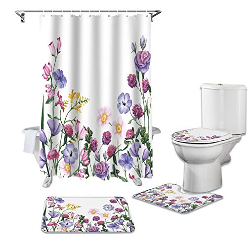 LHGBGBLNのシャワーカーテン4点セットは、カラフルな水彩植物デザインで、バスルームを華やかに演出します。防水性があり、便座クッションとフロアマットも含まれています。