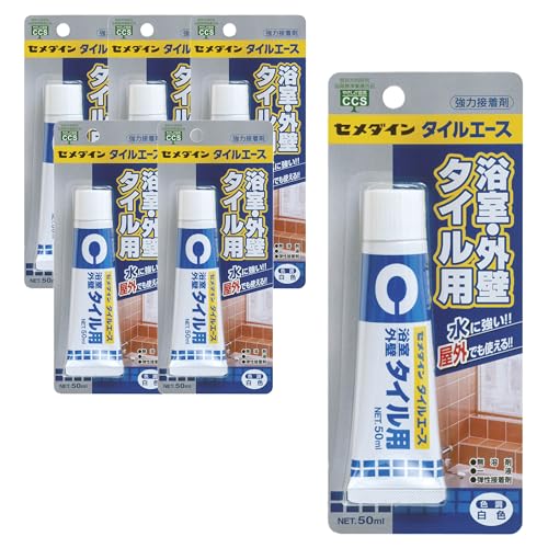 セメダイン タイルエースは浴室や外壁、タイル用の強力接着剤です。白色で、コンクリートやモルタルにも対応。50ml入りが6本セットで提供されています。高い耐水性と耐久性を備え、様々な用途に最適です。