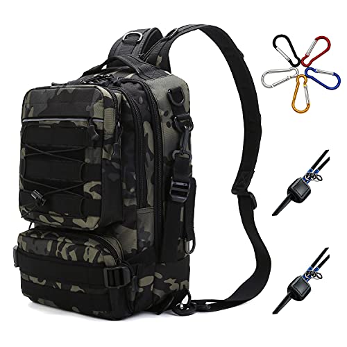 HAKAWAFLYの釣りリュックは5wayで、多機能・大容量。防水仕様で撥水加工済み。ウエストベルト1点、ロッドベルト4点、カラビナ5点付き。15.6インチ対応のネイビーカモフラージュデザインのタックルバッグです。