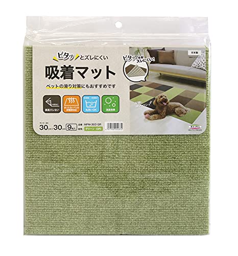 ピタッとズレない吸着マット。ホットカーペット・床暖房対応で安心。丸洗い可能で、消臭機能付き。フリーカット可能なグリーン色の30cm×30cmサイズ、9枚セット。