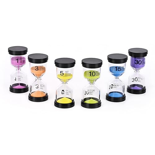 Lubanheartの砂時計6個セットは、1分、3分、5分、10分、15分、30分のタイマーが揃い、デザインもおしゃれでカラフル。サイズは9.7×4.3 cmで、インテリアや子供の教育、キッチンでの使用に最適で、180日保証付きです。
