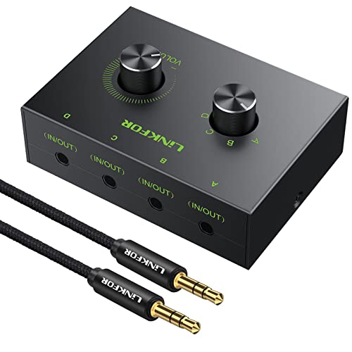 LiNKFOR 4ポートオーディオスイッチャーは、4つの入力と1つの出力、または1つの入力と4つの出力が可能です。3.5mmヘッドフォン対応、音量調整機能付きで、電源不要。MP3、MP4デバイスに対応し、3.5mmオーディオケーブルも付属しています。