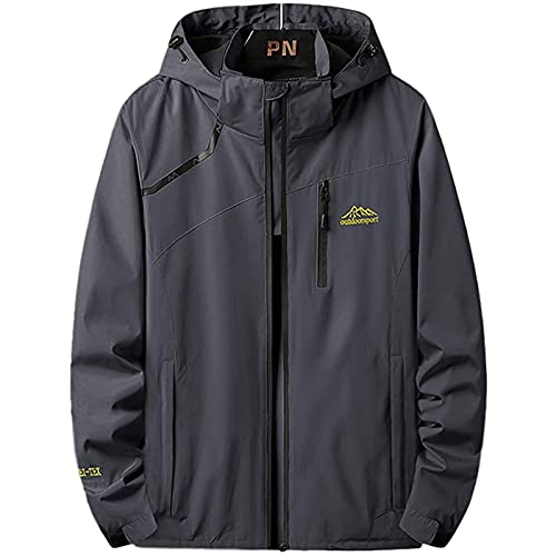 Aquiverのジャケットは、メンズウィンドブレーカーとして春秋冬に最適な防風防寒のアウトドアジャケットです。グレーの無地デザインで、フードは取り外し可能で、5XLサイズ展開しています。
