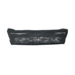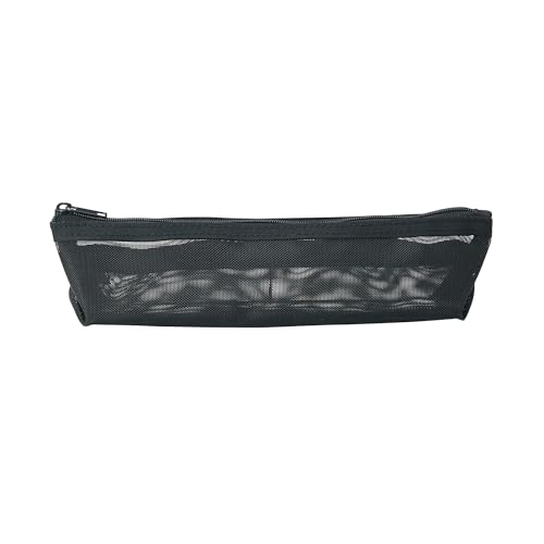 無印良品のナイロンメッシュペンケース(マチ付)は、約幅18.5cm、高さ5cm、マチ4cmのサイズで、シンプルな黒色デザイン。耐久性に優れたナイロン素材を使用しており、文具の整理に最適です。