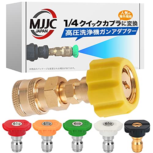MJJC高圧洗浄機ガンアダプターは、1/4クイックカプラへの変換が可能で、ケルヒャーNEW HDシリーズのショートサイズに対応。さらに、5個のスプレーチップが付属し、用途に応じた洗浄が可能です。