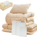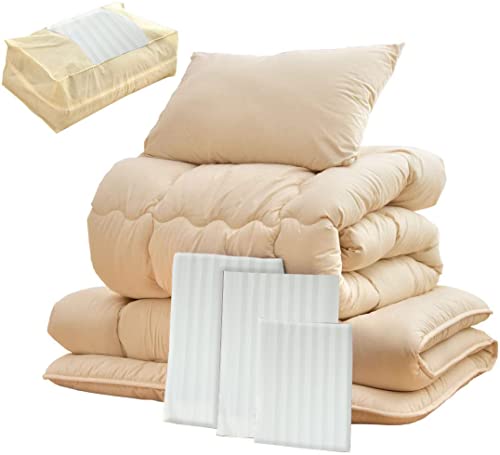 タンスのゲンのセミダブル布団セット(7点)には高密度固綿の三層敷布団が含まれ、抗菌、防臭、防カビ機能があります。洗えるカバーと収納ケース付きで、ホコリが出にくい設計です。