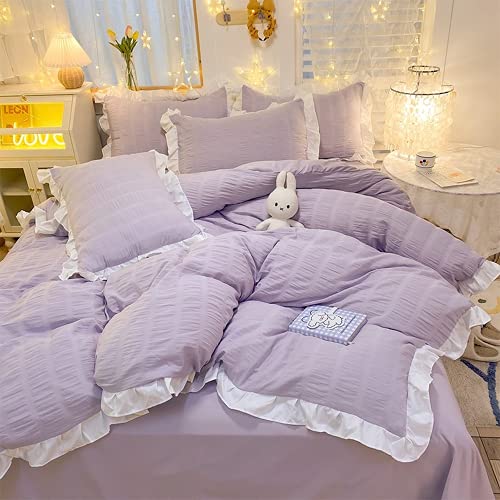 Lifecamoの布団カバーセット(パープル、シングル3点)は、シンプルでおしゃれなラッフルデザイン。洋式と和風に対応し、通気性に優れ、肌にやさしいシアサッカー素材を使用。