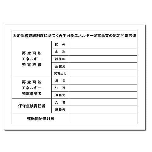 太陽光発電設備標識プレート看板は、アルミ複合板3mm製で屋外用の対候性に優れています。FITガイドラインに準拠した再生可能エネルギーの標識で、サイズはW350mm×H260mmで穴かけ加工済みです。