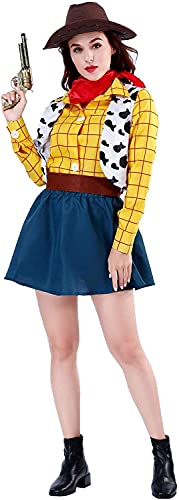 SCLYXのカウボーイコスプレ衣装は大人向けの女性用で、帽子付き。ウッディスタイルのトイストーリーコスチュームで、ハロウィンやイベントに最適。サイズはMです。