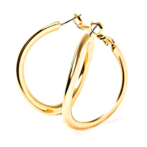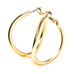 PLUSTERのピアスはシンプルなフープデザインで、チタン製のイエローゴールド仕上げ。金属アレルギーに対応しており、ビッグサイズの40㎜。専用ポーチ付きで、誕生日や母の日のプレゼントに最適です。