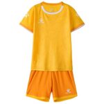 ケルメのサッカーウェアボーイズ用上下セット。Tシャツとパンツが含まれ、イエロー色で160cmサイズ。快適な着用感で、サッカーやフットサルに最適。