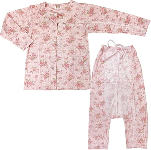 ハナサンテラスの介護用パジャマは、マジックテープで全開、両脇全開のデザイン。婦人サイズMから3Lまであり、寝たきりやおむつ交換に最適です。長袖タイプで、快適性を重視したピンク色。
