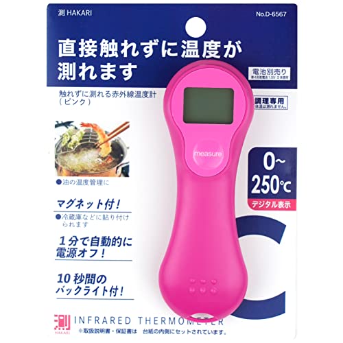 パール金属の赤外線温度計HAKARI D-6567は、触れずに温度を測定できる便利なアイテムです。ピンク色のデザインで、使いやすさとスタイリッシュさを兼ね備えています。