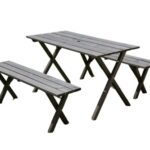 リビングアウトのガーデンテーブルベンチセットは、ダークブラウンの天然木製。テーブルは幅120×奥行59×高さ68cm、ベンチは幅120×奥行28×高さ43cm。パラソル用ホール付きで、広々としたスクエアテーブルとゆったり座れる背もたれ無しのデザイン。