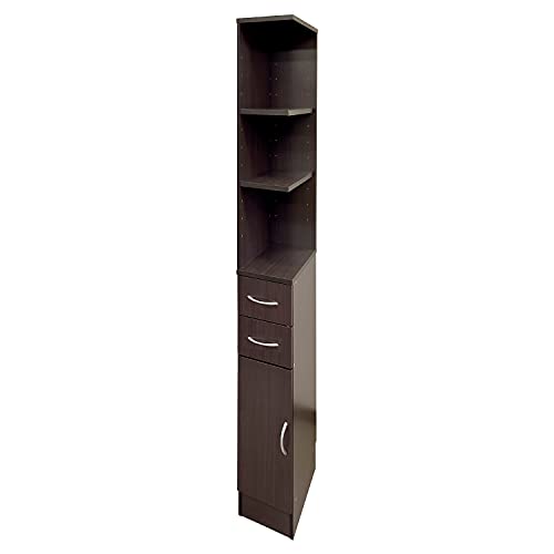 隙間収納ラック コーナータイプ・オルビアは、限られたスペースを有効活用するための収納ラックです。引き出しや扉、二面オープンの棚を備え、ブラウンの優雅なデザインが特徴。