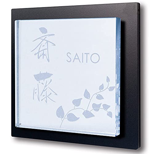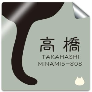 表札ミラーアクリルは、正方形の形状で黒台付き。選べるサイズと接着剤、両面テープが付属し、簡単に貼るだけで設置可能。屋外対応でマンションや戸建のポストプレートに最適です。