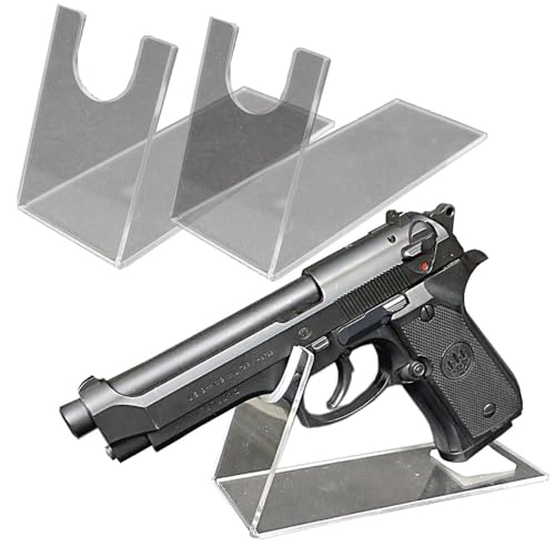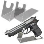 【エムティ】モデルガン・スタンド展示用アクリルディスプレイ(MGS-02_3)は透明で、保護レールとスベリ止めシールが付属。3個入りで、模型を安全に美しく展示できます。