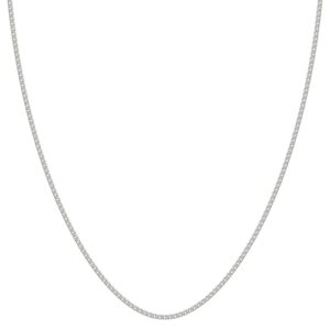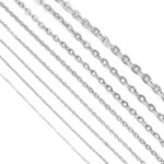 アレルギー対応のステンレス製ネックレスチェーン。サイズは36~70cm、幅は1.0mm~5.0mm。細めから太めまで選べ、5cmのアジャスター付き。シルバー色で、あずきチェーンデザインのスタイリッシュな一品。