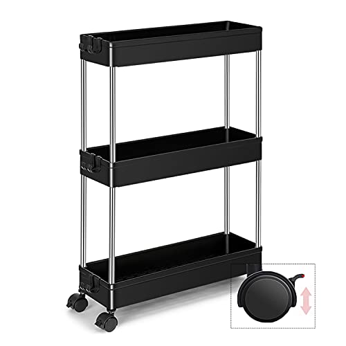 スリムなキッチンワゴンで隙間収納に最適。幅13cm/22.5cmのサイズで、台所や浴室で小物、調味料、ペットボトルを整理。キャスター付きで移動も簡単。おしゃれなブラックデザイン。