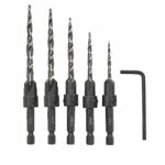 Wolfrideの木工ドリルビット5本セットです。皿穴ドリルビット、六角軸、HSS素材で耐久性抜群。穴あけや面取りに最適なDIY工具。レンチ付きで使用も簡単。