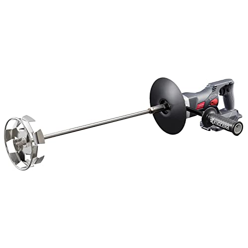 京セラの旧リョービ製充電式パワーミキサーDPM180は、電源不要で低~中粘度材のかくはんが可能。リチウムイオン18V、スクリュー150mm、回転数800min-1で、連続使用60分、充電84分。