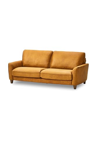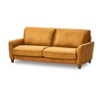 直営サイト限定のレザーテックス製3人掛けソファ。ベルトーネモデル、キャメル色、イタリアンデザインで高級感を演出。関家具の製品で、開梱設置便対応。